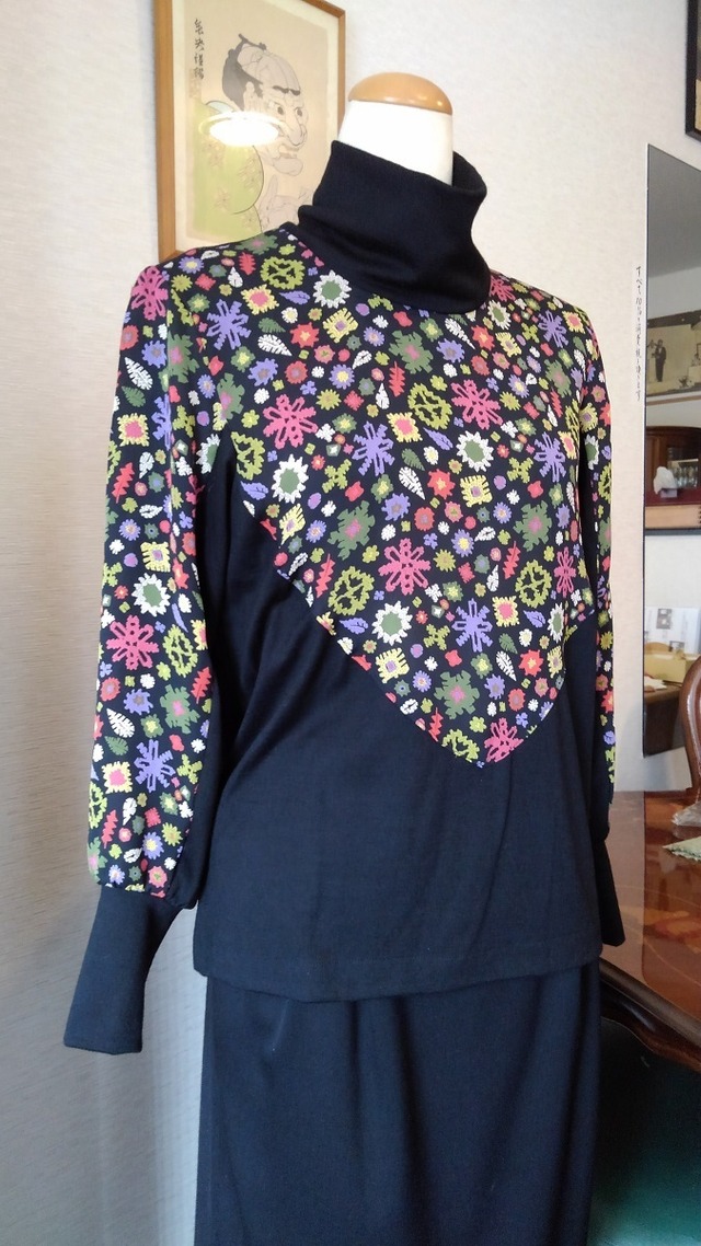 出来上がり寸法 バスト96 着丈56 袖丈55 襟の高さ7 ■使用生地 毛100% プリント部分絹100% ■生地原産国 イタリア ■ドライクリーニング■ブリッジ不可 ■地模様の中肉絹100%。 優しい色合わせにロマンチックなプリントは夢があります。