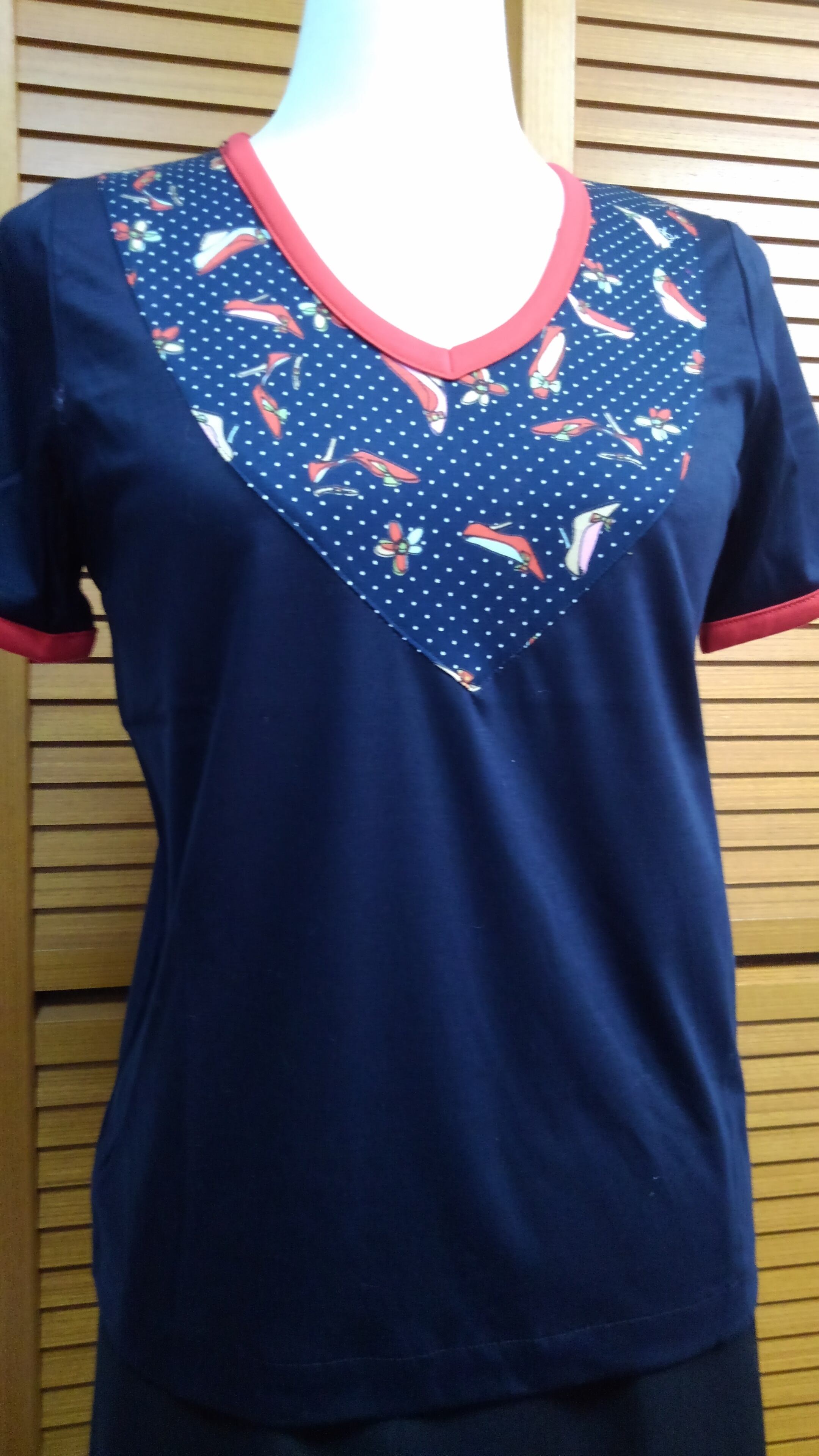 スムースニットの木綿100%のジャージ-は艶も良く着心地もとてもよく切り替えのプリントも可愛い水玉とハイヒール。