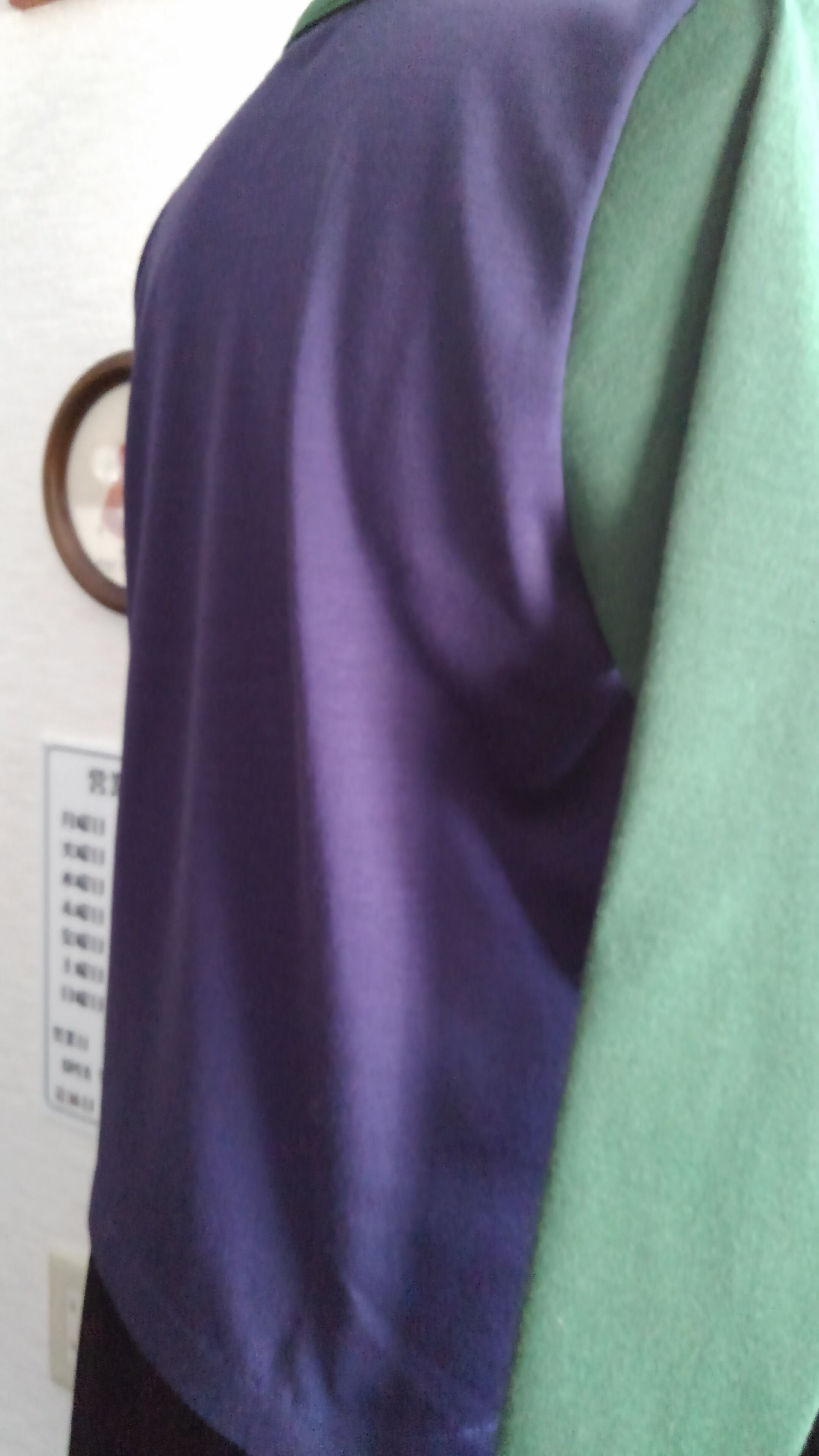 身頃の紫と袖のグリーンの毛100%のジャジーに虹色の猫のアップリケはきれいな色合わせですが良く合っています。