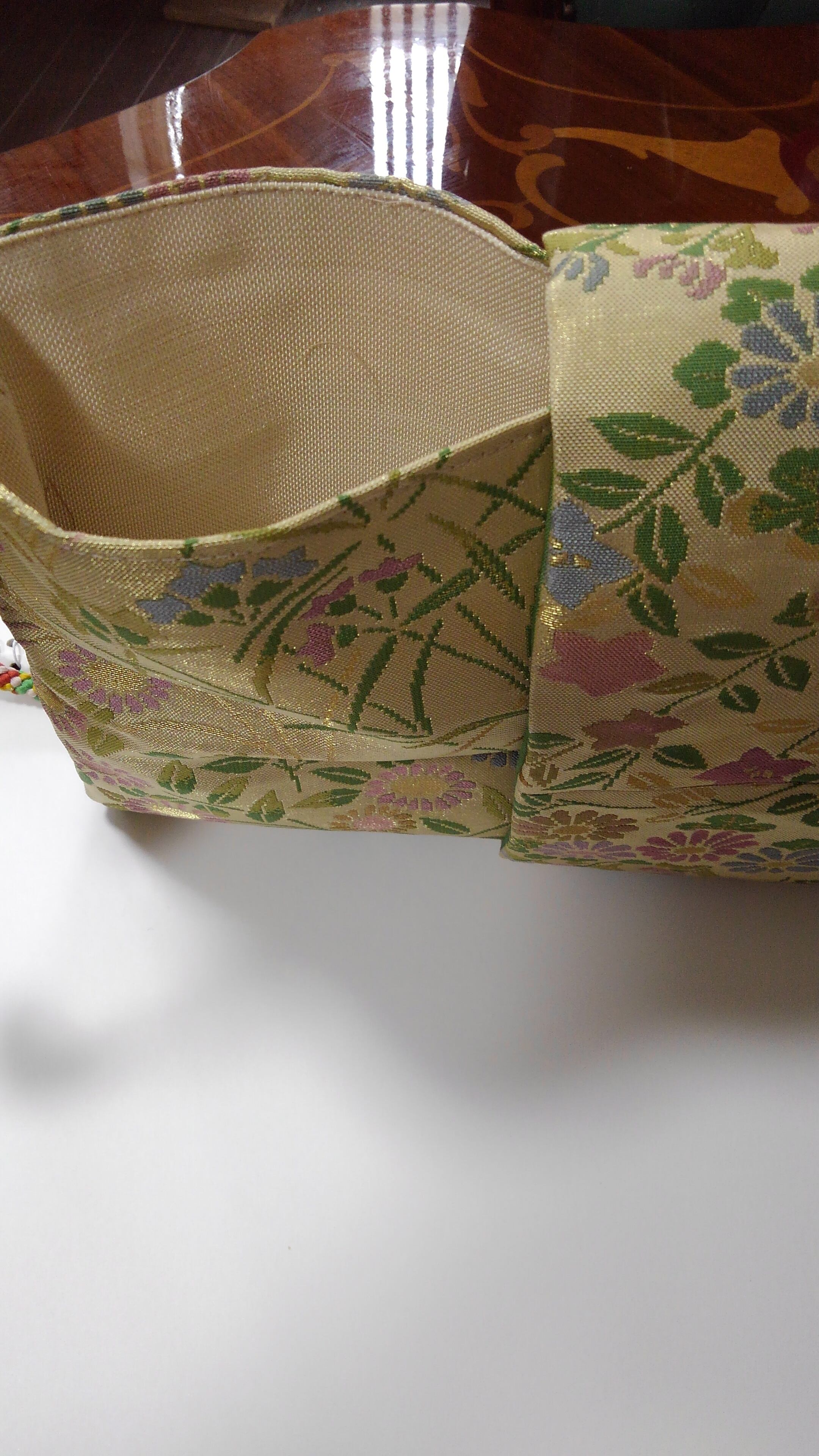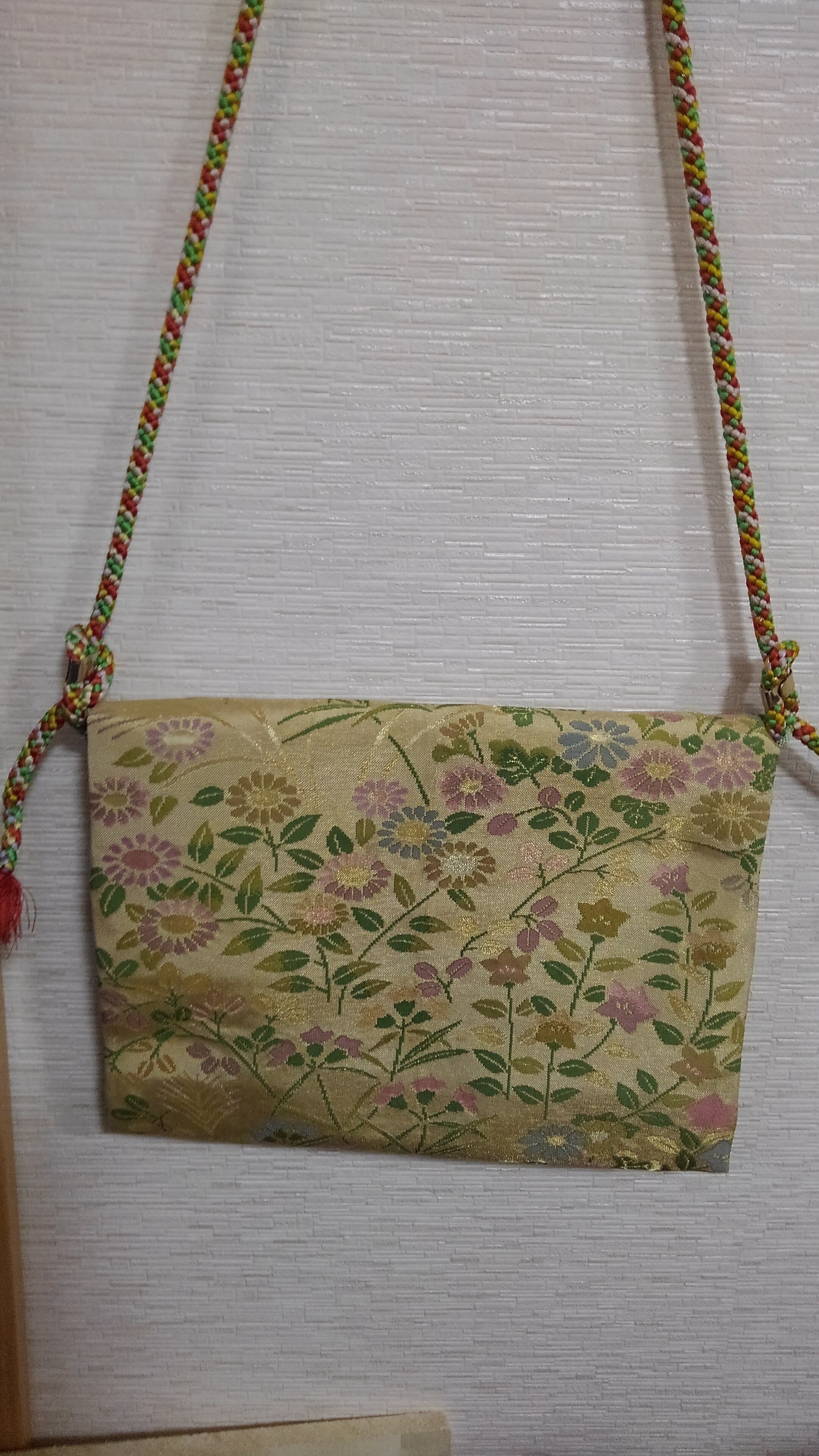 出来上がり寸法 高さ20 横30 絹100%の帯地で仕立て上げたバックは横にスライドしで使用します オリジナルの組紐でオシヤレな一品に
