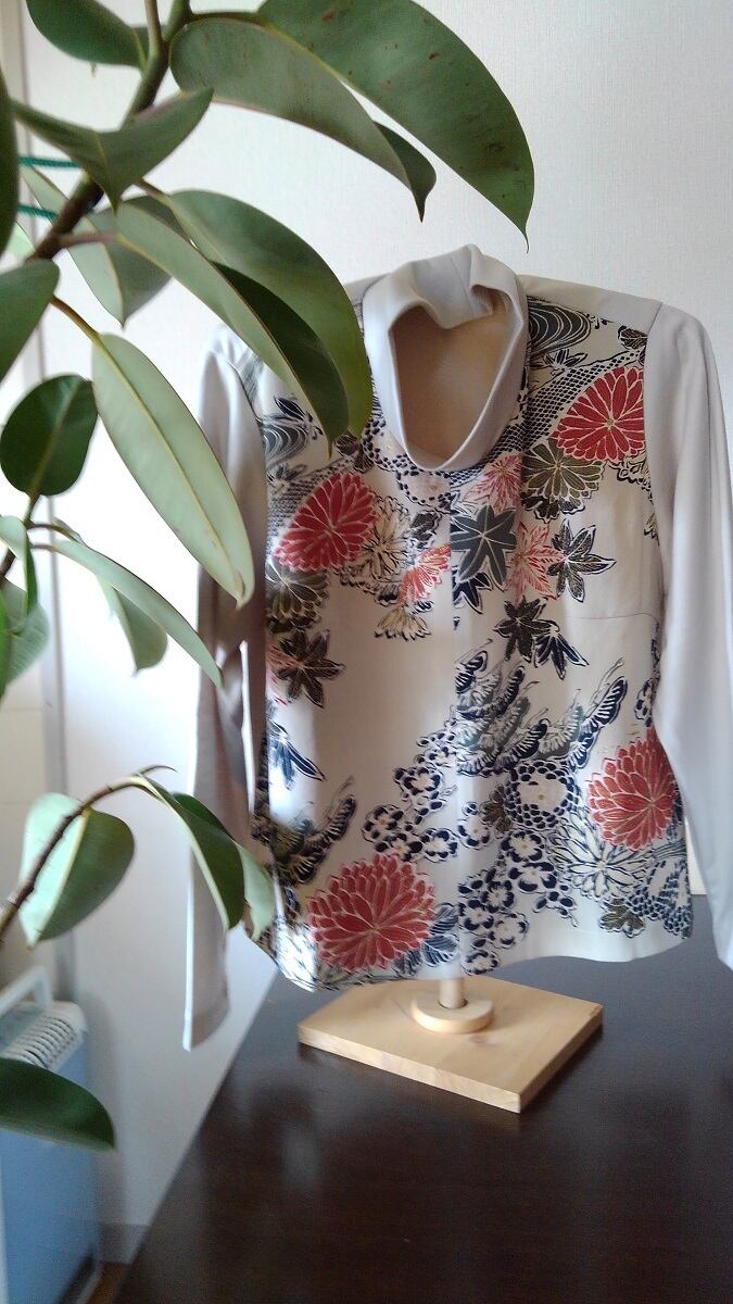 出来上がり寸法. バスト98 着丈56 袖丈55 襟の高さ7 ■使用生地 毛100% プリント部分絹100% ■生地原産国 日本