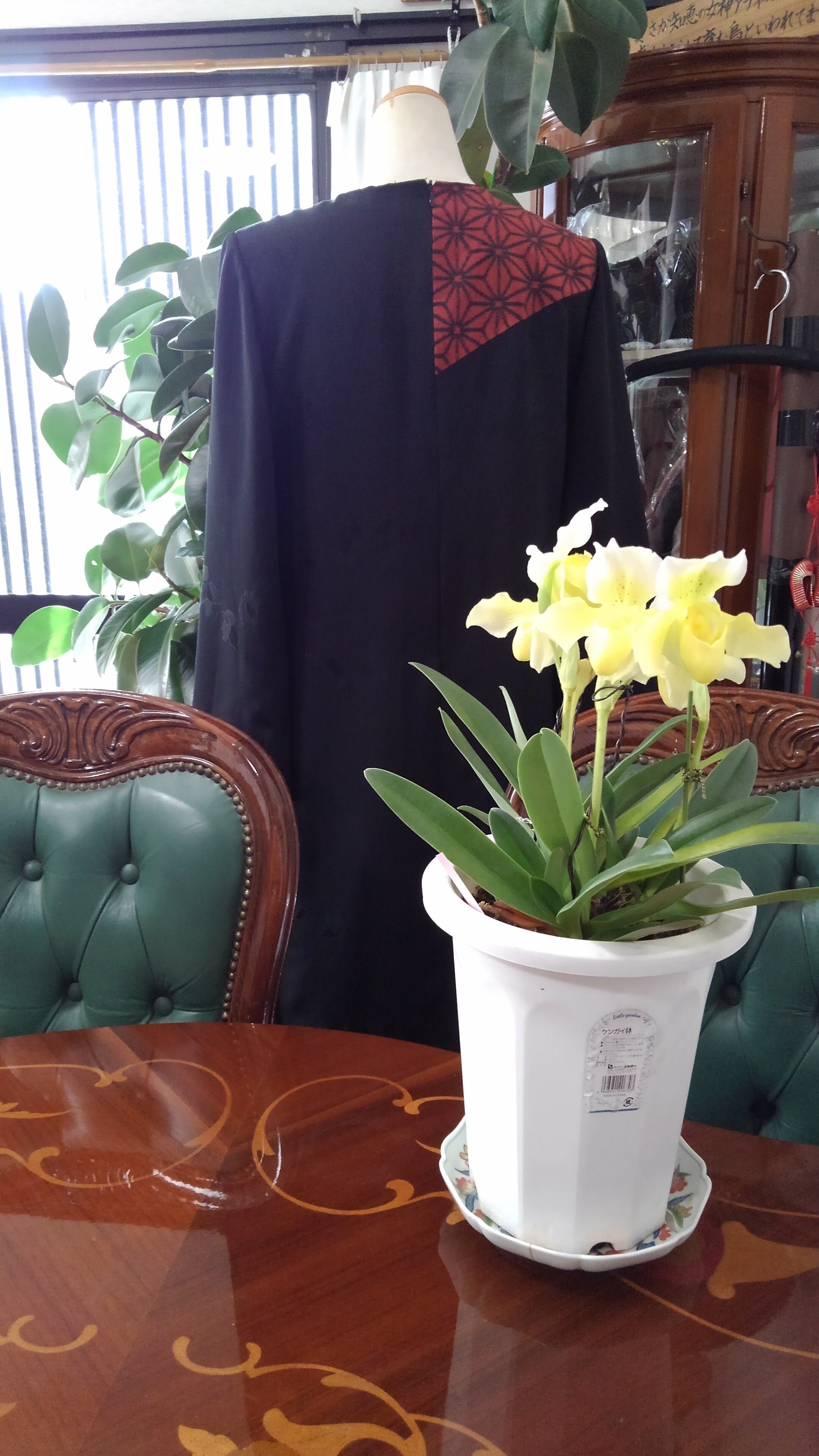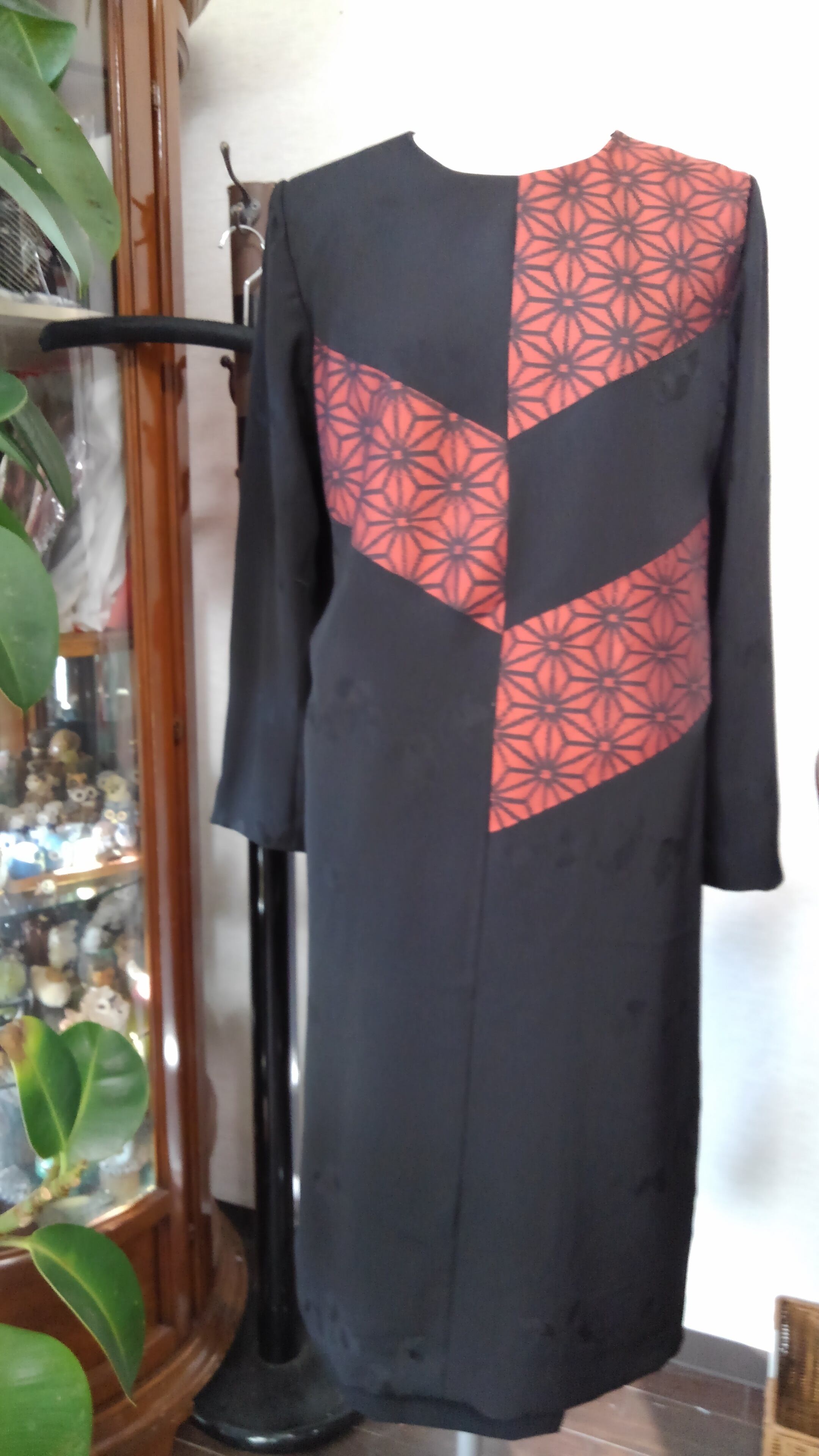 ■真っ黒な羽織生地に麻の葉模様の黄八丈を組み合わせたワンピース