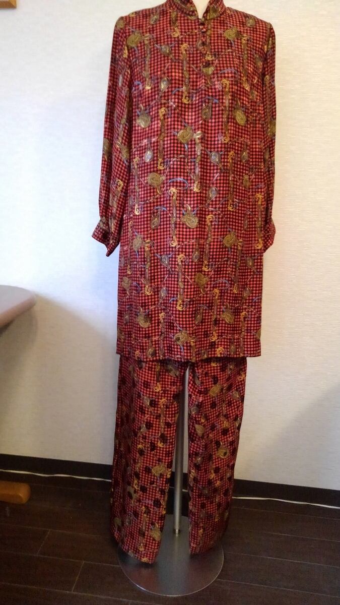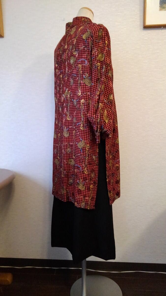 ■赤と黒の格子に馬具の柄の中肉の絹100%の生地は織り込みの水玉に艶があります。