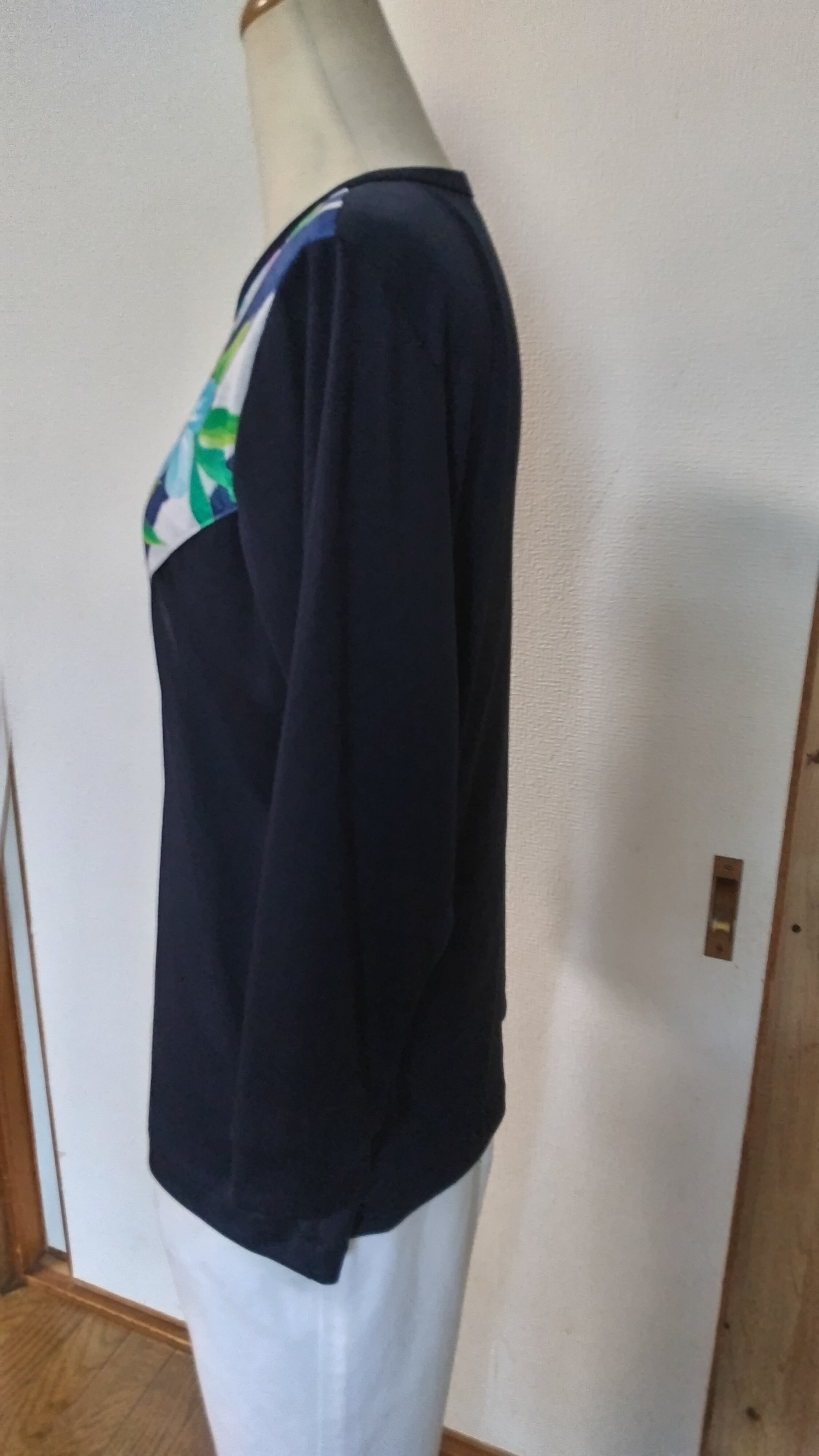 上質な木綿100%のジヤ-ジイに爽やかなプリントを組み合わせたブラウスのようなTシヤツはオシヤレな一点物。